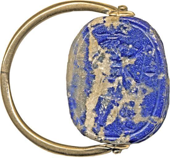 | Keywords: Egyptian - Scarab Ring Bezel - Walters 42151 - Bottom.jpg This lapis lazuli scarab has a hawk-head figure wearing a ram's-horn crown carved into the back In his left hand is a staff from which a lotus blossom dangles century 4 BC Late Period-early Greco-Roman lapis lazuli modern gold mount cm 1 1 1 7 2 1 ; Max outer Diam cm 2 4 ; Max inner Diam cm 2 15 accession number 42 151 35459 H Hoffmann Collection until 1899 mode of acquisition unknown Charles Newton-Robinson London date and mode of acquisition unknown Charles Newton-Robinson Sale Christie Manson and Woods London June 22 1909 lot 1 Dikran Kelekian Paris and New York 1909 by purchase Henry Walters city Baltimore Walters Art Museum Henry Walters Acquired by Henry Walters 1909 Jewelry - Ancient to Modern The Walters Art Gallery Baltimore 1979-1980 place of origin Egypt Walters Art Museum license Ancient Egyptian scarabs in the Walters Art Museum Ancient Egyptian finger rings in the Walters Art Museum Thoth |