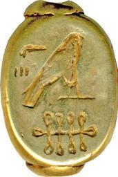 Keywords: Egyptian - Scarab Ring Bezel - Walters 42388 - Bottom.jpg Sheet gold neatly molded across the back and around the edges of a lapis lazuli scarab forms the surface into which finely detailed hieroglyphs are chased A ring of sheet gold was added around the perforations at either end The inscription reads Chiefs of The Priestly Guild of Horus which suggests that the ring was a mark of professional status between 1186 1070 BC late New Kingdom lapis lazuli gold setting cm 0 7 1 1 5 accession number 42 388 34999 Maurice Nahman Cairo date and mode of acquisition unknown Henry Walters city Baltimore Walters Art Museum Henry Walters Acquired by Henry Walters 1930 Translation Leaders of the priestly group phyle of Horus Jewelry - Ancient to Modern The Walters Art Gallery Baltimore 1979-1980 place of origin Egypt Walters Art Museum license Ancient Egyptian scarabs in the Walters Art Museum Ancient Egyptian finger rings in the Walters Art Museum Jewellery of the 20th dynasty of Egypt Hieroglyphs on metal Horus-falcon hieroglyph Phallus hieroglyph Leg fetter sa hieroglyph