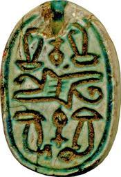 | Keywords: Egyptian - Scarab with Crowns and Cobras Design - Walters 4233 - Bottom (2).jpg This steatite scarab has a flat underside with a vertically and horizontally arranged design with the combination of two lower Egyptian crowns and four cobras with raised upper bodies on baskets The design of the back is detailed with finely incised lines and regular line flow The proportions of the top are well balanced The piece is simply made with good workmanship The scarab functioned as an amulet with kingship connotations The amulet refers to all-inclusive divine protection royal power and perfection The red crown symbolizes not only the royal aspect but also magical power and strengthens the protective function of the amulet The scarab originally would have been mounted or threaded ca 1794 1539 BC late Middle Kingdom-Second Intermediate; MB IIB light brown steatite with blue-green glaze cm 0 9 1 3 1 9 accession number 42 33 16939 Henry Walters Baltimore 1929 mode of acquisition unknown Walters Art Museum Henry Walters Acquired by Henry Walters 1929 Inscription Combination of two lower Egyptian crowns four cobras with raised upper body on baskets and two nfr-signs perfection place of origin Palestine <gallery> File Egyptian - Scarab with Crowns and Cobras Design - Walters 4233 - Bottom jpg </gallery> Walters Art Museum license Ancient Egyptian scarabs in the Walters Art Museum Cobra in basket hieroglyph Media contributed by the Walters Art Museum needs category review |