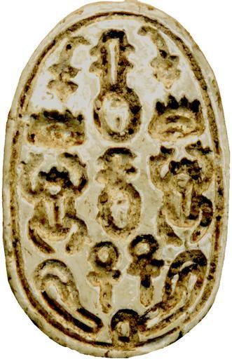 | Keywords: Egyptian - Scarab with Script Signs - Walters 4212 - Bottom (2).jpg This steatite scarab was originally glazed It has a flat underside with a vertically arranged bottom design with a combination of seven different script signs six of which appear twice The design of the scarab's back is simple with short aligned side-notches and well balanced proportions The piece is simply made and the workmanship is good This multifunctional amulet should provide royal and divine support good luck life renewal and protection The double presence of the six signs refers to the creation and the single sun disc to the creator The amulet should protect and support its owner in all different situations The piece was originally mounted or threaded Scarabs displaying hieroglyphic sign arrangements without syntactical context are typical for the late Middle Kingdom and the Hyksos Period ca 1794 1539 BC late Middle Kingdom-Second Intermediate; MB IIB light beige steatite cm 0 8 1 1 1 7 accession number 42 12 28134 Henry Walters Baltimore 1911 mode of acquisition unknown Walters Art Museum Henry Walters Acquired by Henry Walters 1911 Translation The combination has seven different hieroglyphic signs of which six appear twice only the sun disc is not repeated The terms are King - appearance perfection/good luck come into being beginning - life Re life - beginning place of origin Egypt <gallery> File Egyptian - Scarab with Script Signs - Walters 4212 - Bottom jpg </gallery> Walters Art Museum license Ancient Egyptian scarabs in the Walters Art Museum |