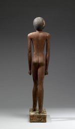 | Keywords: Egyptian - Standing Male Figure - Walters 22211 - Back.jpg For a short period during the late Old Kingdom and the 1st Intermediate Period it was popular to show the tomb's owner without clothes These figures represent the deceased in the phase of renewal in front of the god Osiris lord of the underworld This tomb statue depicts a standing nude male with his left food advanced His body is inclined slightly backward perhaps to give the impression of striding Both of his arms are at his sides and both of his hands are closed This is possibly to indicate that he is holding something but we cannot discern exactly what it is as whatever it is does not extend out of his hands on either side His eyebrows are carved in relief and there are lines at the corners of his nose He wears a short haircut leaving his rather large ears uncovered He has a very deeply carved belly button and his toes are carved so as to be completely separated from each other; his fingers are not carved as deeply The rectangular base that he stands on is original and carries the inscription which reads the sole companion Ha'a The body is painted red the nipples black the hair black the eyes black and white and the base is painted black on the sides and red on its top The front of the left foot the left arm the right arm and the body were all made separately and were attached using dowels as can be seen in the case of the right leg The arms are joined at the shoulders The statue is anchored to the base by means of two wooden dowels which go through the base and through an invisible prong located under the right foot In addition to extensive paint loss in numerous places on the surface of this piece this statue has also suffered structural damage Cracks exist down the length of the base's top; a crack in the top of the back end of the base is filled in probably a modern repair In addition the top of the left foot the right shoulder joint and the back of the right hand are damaged between 2236 2150 BC late Old Kingdom-First Intermediate wood with red white and black paint cm 54 11 7 23 ; H with base cm 53 2 accession number 22 211 40432 Dikran Kelekian New York and Paris date and mode of acquistion unknown as 12th Dynasty Assiout Henry Walters city Baltimore Walters Art Museum Henry Walters Acquired by Henry Walters 1914 Translation On base the sole companion Ha'a Carved for Immortality The Walters Art Museum Baltimore 2004-2005 place of origin Meir Egypt Walters Art Museum license Ancient Egyptian statues in the Walters Art Museum Media contributed by the Walters Art Museum needs category review |