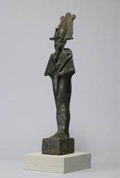 | Keywords: Egyptian - Statue of Osiris - Walters 54551 - Three Quarter Left.jpg The god of resurrection Osiris reigned supreme in the underworld He combined the elements of death regeneration and fertility in his mythology He was also connected with crops and the annual floods Osiris took on funerary associations when he was linked with other underworld gods as his cult spread across the land This combination of fertility and funerary aspects made Osiris the principal god of the dead One of his titles is chief of the westerners the west being the domain of the dead Here the god is shown in his standard iconography attired in a mummiform garment his hands projecting from the wrappings to hold the royal insignia of crook and flail He wears the elaborate atef crown-composed of the tall white crown double plumes ram horns and uraeus sacred cobra -as well as a ceremonial braided beard This statue is of extraordinary size ca 580 550 BC Late Period hollow cast bronze cm 60 96 14 accession number 54 551 36613 Dikran Kelekian New York and Paris date and mode of acquisition unknown Henry Walters city Baltimore Walters Art Museum Henry Walters Acquired by Henry Walters 1914 place of origin Upper Egypt Walters Art Museum license Ancient Egyptian statues in the Walters Art Museum Statues of the Egyptian late period Statues of Osiris Braided beards |