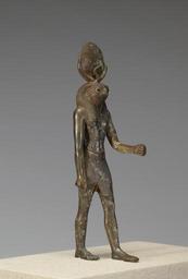 Keywords: Egyptian - Statue of a Standing Khonsu - Walters 54395 - Three Quarter Right.jpg Khonsu could be represented either as a youth or a falcon-headed male with a moon-disk and crescent on his head as here He is mentioned as a moon god in the pyramid texts as early as the 3rd millennium BC As the son of Amun and Mut he was worshipped in Karnak where he had his own temple from the Middle Kingdom onwards ca 664 525 BC Late Period bronze with gold and glass inlay cm 28 5 5 7 8 2 accession number 54 395 1730 Dikran Kelekian New York and Paris date and mode of acquisition unknown Henry Walters city Baltimore Walters Art Museum Henry Walters Acquired by Henry Walters 1912 place of origin Memphis Egypt Walters Art Museum license Ancient Egyptian statues in the Walters Art Museum Statues of the Egyptian late period Media contributed by the Walters Art Museum needs category review |