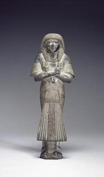 | Keywords: Egyptian - Ushabti Figure of Amen-em-ipet - Walters 22177.jpg This dark gray stone ushabti belonged to Amen-em-ipet the Chief of the Doorkeepers Typical of ushabtis of the Ramesside Period he does not wear a mummiform garment but rather a long pleated robe representative of the clothing of the upper class On the pleated apron at the front of the robe The dividing lines between the lines of text have been painted red The figure stands upon a small rounded base and seems to have a squared pillar between his feet Also typical of this period he wears a duplex wig with the hair curled into small plaits and a double necklace His arms are crossed over his chest and he holds a djed pillar the symbol of stability in his right hand and a tjet or knot of Isis in his left hand for protection His face is broad and reminiscent of a funerary mask with delicate cosmetic lines The mouth is well defined and almost smiling and he wears a very short squared beard There is a modern hole beneath the feet from a previous mounting ca 1260 BC New Kingdom dark gray serpentine cm 30 5 11 2 6 5 accession number 22 177 15837 Dikran Kelekian New York and Paris Henry Walters city Baltimore Walters Art Museum Henry Walters Acquired by Henry Walters 1923 Translation Vertical text The Enlightened One Osiris The Chief of the Doorkeepers he says; Translation Horizontal lines of text O' Shabti of the Chief Doorkeeper Osiris Amen-em-ipet true of voice for the doing of any work that is to be done in the Necropolis to cultivate the fields to irrigate the riverbanks to ferry sand from the east to the west or any task that is unpleasant imposed upon him there as a man at his duties The Doorkeeper at anytime Osiris Chief of the Doorkeepers Amen-em-ipet true of voice I will do any work for the Chief of the Doorkeepers Amen-em-ipet true of voice place of origin Egypt Walters Art Museum license Ushabti in the Walters Art Museum Ushabti of the Egyptian New Kingdom |