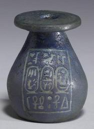 Keywords: Egyptian - Vase with Names of Amenhotep III and Queen Tiye - Walters 48403.jpg Royalty of the 18th Dynasty commissioned luxury goods in glazed faience and glass Vessels bearing royal names could have been reserved for royal use or given as gifts to worthy subjects or visitors to the court This vase contains the names of King Amenophis Amenhotep III and Queen Tiye This small vase was once a part of the MacGregor collection The vessel's shape imitates a bag or a sack It was a popular shape during the 18th Dynasty in pottery stone painted wood to imitate stone as well as faience The bottom of the vessel is flat allowing it to stand freely on a flat surface The flat top of the vessel could have originally been closed by a similarly shaped flat lid as is seen in many examples dating to the 18th Dynasty The faience most probably incorporates cobalt mixed with copper for the rich dark-blue color Before the 18th Dynasty blue was produced with copper however during the 18th Dynasty cobalt mixed with copper was introduced Cobalt is not attributable to any region or site from the time of Amenophis Amenhotep III The vessel shows a dark residue on the inside Although chemical analysis has not yet been performed to determine what kind of substance the vessel contained it is possible that it originally contained some kind of expensive cosmetic possibly kohl oil or perfume ca 1370 BC New Kingdom Egyptian faience with dark blue glaze H 2 13/16 x Diam at base 2 5/16 in 7 2 x 5 8 cm ; Diam at top cm 4 8 accession number 48 403 481 Dikran Kelekian Paris and New York date and mode of acquisition unknown Henry Walters city Baltimore Walters Art Museum Henry Walters Acquired by Henry Walters 1923 Translation Perfect god Neb-maat-Re son of Re Amenhotep-Ruler of Thebes may he live like Re; Royal wife Tiye may she live place of origin Attica Greece Walters Art Museum license Ancient Egyptian pottery in the Walters Art Museum Amenhotep III Cartouches of Amenhotep III Tiye |