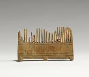 | Keywords: Egyptian - Wooden Comb - Walters 61306.jpg Walters 61 306 is a comb carved from a single piece of wood possibly Sycamore Fig There are thirty flat rectangular teeth The two outermost teeth are slightly wider than the others and are rounded on the outer edges The comb is rectangular in shape and the upper edge is rounded It is modestly decorated with three rectangular projections along the top edge and two pairs of straight incised lines located just below the projections and just above the top of the teeth This type of decoration is typical for simple combs of the 18th Dynasty Several of the teeth are broken and there are surface stains from water or some other liquid The multitude of scratches on the surface of the wood suggest that the object was actually used during the life of its owner Combs like this were probably used for one's natural hair rather than for the elaborate wigs of the New Kingdom that required special instruments between 1550 1307 BC New Kingdom wood cm 7 6 accession number 61 306 1724 Private collection Walters Art Museum Anonymous gift 1960 In Search of Ancient Treasure 40 Years of Collecting The Walters Art Gallery Baltimore 1978 place of origin Greece Walters Art Museum license Ancient Egyptian art in the Walters Art Museum Ancient Egyptian combs Media contributed by the Walters Art Museum needs category review |