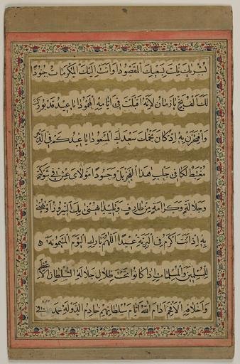 | Keywords: Eid Blessings WDL6855.png Artwork ru Али ухаммад fr Ali Muhammad en 'Ali Muhammad zh 穆罕默德·阿里 pt 'Ali Muhammad ar علي، محمد es 'Ali Muhammad ru Благословение в п аздник Ид fr Bénédictions de l'Aïd en Eid Blessings zh 斋节 福 pt Bênçãos de Eid ar التهنئة بالعيد ru В данном каллиг афическом ф агменте п иводятся благословения на а абском языке в ад ес п авителя по случаю наступления Ида П аздника азговения В текст написанный че ными че нилами письмом насх на бежевой бумаге включено несколько эпитетов и титулов возвеличивающих пок овителя Слова об амлены облакооб азными полосами на золотом фоне и в них че ным цветом обозначены все гласные звуки Текстовая панель об амлена каймой ук ашенной к асными синими и зелеными о наментами из цветов и вьющихся астений и наклеена на больший по азме у о анжево- озовый лист бумаги с ка тонной подложкой В нижнем левом углу каллиг аф ухаммад Али подписал свою аботу и поставил дату 1142 год хидж ы 1729 1730 гг Ве оятно изначальное полное имя каллиг афа включавшее в себя имя Али было сте то наме енно В таком случае дата возможно тоже была впоследствии исп авлена Текстовые панели подобные этой с азличными молитвами на а абском языке написанные ш ифтом насх п инадлежали пе у известных пе сидских каллиг афов воз ождающих письмо насх а именно и зы Ахмада ай изи уме в 1739 году / в 1152 году хидж ы и его последователей По этой п ичине данная абота ве оятнее всего была выполнена пе сидским каллиг афом аботавшим в XVIII веке <br>А абская каллиг афия; А абские укописи; П аздники; Иллюмини ование укописей; Исламская каллиг афия; Исламские укописи; Ид аль-Адха fr Ce fragment de calligraphie propose des bénédictions en arabe à un souverain à l'occasion de l'Aïd également transcrit Id De nombreux épithètes et titres de mécène sont inclus dans le texte qui est exécuté en écriture nastaliq à l'encre noire sur un papier beige Les mots sont totalement vocalisés en noir et encadrés de bandes de nuages sur fond doré Le panneau de texte comporte une bordure décorée de motifs de fleurs et de vigne rouges bleues et vertes Il est collé sur un papier orange saumon plus grand renforcé par du carton Le calligraphe Muhammad Ali a signé son œuvre et l'a datée de 1142 après l'Hégire 1729 1730 après J -C dans le coin inférieur gauche Il semble que le nom du calligraphe d'origine qui comprenait le nom Ali ait été effacé intentionnellement En conséquence il est possible que la date soit aussi une correction ultérieure Les panneaux de texte comme celui-ci contenant diverses prières en arabe en écriture naskh ont été faits par le célèbre calligraphe persan du renouveau du naskh Mirza Ahmad Nayrizi mort en1152 après l'Hégire/1739 après J -C et ses disciples Pour cette raison il est très probable que cette pièce ait été exécutée par un calligraphe perse actif durant le XVIII<sup>e</sup> siècle <br>Calligraphie arabe; Manuscrits arabes; Jours fériés; Enluminures; Calligraphie islamique; Manuscrits islamiques; Id al-Adha en This calligraphic fragment provides Arabic blessings to a ruler on the occasion of Eid also seen as 'Id A number of the patron's epithets and titles are included in the text which is executed in black Naskh script on a beige paper The words are fully vocalized in black and are framed by cloud bands on a gold background The text panel is framed by a border decorated with red blue and green flower and vine motifs and is pasted to a larger salmon-orange colored piece of paper backed by cardboard In the lower-left corner the calligrapher Muhammad 'Ali has signed his work and dated it 1142 AH 1729 30 It appears that the original calligrapher's name which included the name 'Ali was erased purposefully It is possible therefore that the date constitutes a later correction as well Text panels such as this one providing various Arabic-language prayers in Naskh script were made by the famous Naskh-revival Persian calligraphers Mirza Ahmad Nayrizi died 1152 AH/1739 and his followers For this reason it is most likely that this piece was executed by a Persian calligrapher active during the 18th century <br>Arabic calligraphy; Arabic manuscripts; Holidays; Illuminations; Islamic calligraphy; Islamic manuscripts; ʻĪd al-Aḍḥā zh 此书法残卷包含 斋节(Eid,也称 'Id)时对统治 的阿拉伯语 福 文字内容中包含许多赞助人的尊号和头衔,以黑色纳斯赫体书写 米色的纸张上 单词 以黑色字体书写并被全部加上元音,周围是带状云彩图案,背景为金色 字幅的边框装饰 红色 色和绿色的花 和藤蔓图案,并粘贴到 张更大的粉橙色纸张上,背衬 纸 左下角,书法家(穆罕默德)阿里 Muhammad 'Ali 品上署名,并标注日 为伊斯兰历 1142 年(公元 1729-1730 年) 原 书法家的名字(包含名字 阿里 )似乎被故意擦