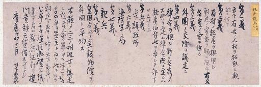 Keywords: Eight-Point Program for a New Government WDL2939.png Artwork ru Гото Шодзи о 1838-1897 fr Gotō Shōjirō 1838-1897 en Gotō Shōjirō 1838-1897 zh 后藤 象二郎 1838-1897 pt Gotō Shōjirō 1838-1897 ar ساكاموتو ريوما 1836-1867 es Gotō Shōjirō 1838-1897 ru П ог амма из восьми пунктов для нового п авительства fr Programme en huit points pour un nouveau gouvernement en Eight-Point Program for a New Government zh 新政 八项主张计划 pt Programa de Oito Pontos para um Novo Governo ar البرنامج ثماني النقاط للحكومة الجديدة ru Этот мануск ипт является укописным п оектом п едложений сфо мули ованных Сакамото Рёма 1836-1867 гг и Гото Содзи о 1838-1898 гг п оимпе скими активистами из области Тоса ныне п ефекту а Коти на западе Японии в 1867 г В этом документе Рёма и Содзи о п едложили п ог амму политических ефо м из восьми пунктов кото ую необходимо было еализовать новому импе скому п авительству после ожидаемой отставки Токугавы Ёсинобу 1837-1913 гг последнего сёгуна П едложенные ефо мы включали п инятие новых фундаментальных законов п ивлечение способных людей на оль госуда ственных советников установление дипломатических отношений с за убежными ст анами и уч еждение па ламента и штаб-ква ти ы а мии и флота <br>Политика и уп авление fr Ce manuscrit est l'ébauche écrite à la main de propositions formulées par Sakamoto Ryōma 1836-67 et Gotō Shōjirō 1838-97 activistes pro-impériaux du Domaine de Tosa aujourd'hui préfecture de Kochi à l'ouest du Japon en 1867 Dans ce document Ryōma et Shōjirō proposèrent un programme en huit points de réformes politiques à mettre en œuvre par le nouveau gouvernement impérial après l'abdication prévue de Tokugawa Yoshinobu 1837-1913 le dernier shogun Ces réformes proposées comportaient la promulgation de nouvelles lois fondamentales le recrutement de personnes compétentes pour servir de conseillers gouvernementaux l'établissement de relations diplomatiques avec les puissances étrangères et la création d'un parlement et d'un état-major pour l'armée et la marine <br>Politique et gouvernement en This manuscript is the handwritten draft of proposals formulated by Sakamoto Ryōma 1836-67 and Gotō Shōjirō 1838-97 pro-imperial activists from the Tosa Domain now Kochi prefecture in western Japan in 1867 In this document Ryōma and Shōjirō proposed an eight-point program of political reforms to be undertaken by the new imperial government after the expected resignation of Tokugawa Yoshinobu 1837-1913 the last shogun The proposed reforms included enactment of new fundamental laws recruitment of capable people to serve as government advisers establishment of diplomatic relations with foreign powers and establishment of a parliament and of a headquarters for the army and the navy <br>Politics and government zh 这份手稿是 龙马(1836-67 年)和后藤象二郎(1836-97 年)1867 年提案的手写草稿,两人都是日 西部的 佐藩(今高知县)出身 该文件中, 龙马与后藤象二郎提出了八 政治改 计划 船中八策 ,以供新 国政 日 后 位将军德 庆 (1837-1913 年) 位后采用 这些改 建议包括制定新的基 法律 重用 才能的人担任政 顾问 与外国中的强国建立外交关系并成立议会和陆海军 部 <br>政治与政 pt Este manuscrito é o esboço feito à mão de propostas formuladas por Sakamoto Ryōma 1836-67 e Goto Shojiro 1838-97 ativistas proimperialistas do Domínio de Tosa hoje prefeitura de Kochi no oeste do Japão em 1867 Neste documento Ryōma e Shojiro propuseram um programa de oito tópicos de reformas políticas a serem implementadas pelo novo governo imperial após a esperada renúncia de Tokugawa Yoshinobu 1837-1913 o último shogun As reformas propostas incluíam a promulgação de novas leis fundamentais o recrutamento de pessoas capazes de servir como consultores governamentais o estabelecimento de relações diplomáticas com potências estrangeiras e a criação de um parlamento e de uma sede para o exército e a marinha <br>Política e governo ar هذه المخطوطة مسودة مكتوبة باليد للمقترحات التي صاغها ساكاموتو ريوما 1836-67 وغوتو شوجيرو 1838-97 ، من النشطاء الموالين للإمبراطورية، من إقليم توسا مقاطعة كوشي حاليا في غرب اليابان، عام 1867 في هذه الوثيقة، طرح ريوما وشوجيرو برنامجا للإصلاح السياسي من ثمان نقاط للضطلاع بها من قبل الحكومة الإمبراطورية الجديدة بعد الاستقالة المتوقعة لتوكوغاوا يوشينوبو 1837-1913 ، الشوغان الأخير وشملت الإصلاحات المقترحة سن قوانين أساسية جديدة، وتوظيف الناس المقتدرين للعمل كمستشارين حكوميين، وإقامة علاقات دبلوماسية مع الدول الأجنبية، وإنشاء برلمان ومقر قيادة للجيش والقوات البحرية <br>السياسة والحكومة es Este manuscrito es el proyecto a mano de las propuestas formuladas por Sakamoto Ryōma 1836-1867 y Gotō Shōjirō 1838-1897 activistas proimperiales del dominio Tosa actualmente la prefectura de Kochi en el oeste de