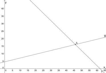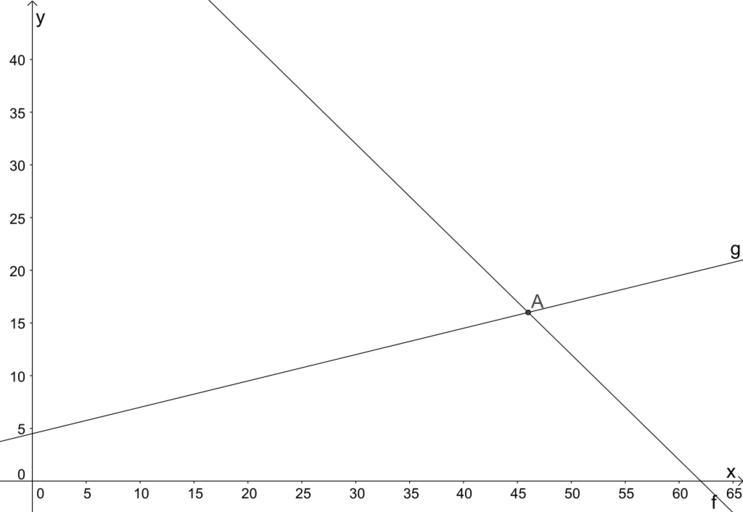 Keywords: Ein Vater und ein Sohn sind zusammen 62 Jahre alt.svg Ein Vater und ein Sohn sind zusammen 62 Jahre alt Vor sechs Jahren war der Vater viermal so alt wie damals der Sohn Wie alt ist jeder <math>\begin matrix 1 x + y 62 \\ 2 x - 6 4 \cdot y - 6 \end matrix </math> Mit der Lösung x 46 y 16 In diesem Punkt A schneiden sich die beiden Geraden f x und g own Emdee 2015-11-10 Cc-zero Mathematica diagrams |