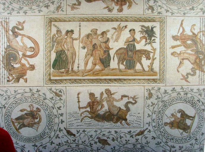Keywords: El Jem Museum (11).JPG en Bacchus and his cortege A mosaic in the archaelogical museum of El Jem Own Effi Schweizer 2009-03-18 Drunken Silenus mosaic in the El Jem museum