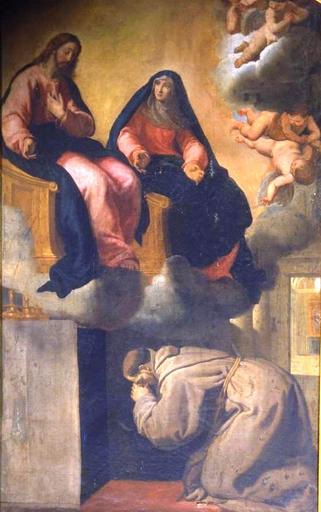 Keywords: El jubileo de la Porciúncula, de Francisco Fernández (Real Academia de Bellas Artes de San Fernando).jpg La obra representa a San Francisco de Asís el fundador de la Orden de los franciscanos recibiendo de manos de Jesucristo y de la Virgen María la Indulgencia o el Jubileo de la Porciúncula ya que en 1216 el papa Honorio III concedió una indulgencia plenaria a todos aquellos que visitaran la pequeña iglesia de la Porciúncula que está situada en el interior de la basílica de Nuestra Señora de los Ángeles de Asís en Italia Siglo XVII oil on canvas Size cm 155 285 Institution Real Academia de Bellas Artes de San Fernando http //ceres mcu es/pages/Main accession number 0861 http //ceres mcu es/pages/Main PD-old-100 Saint Francis receives the Indulgence of Portiuncola 1216 17th-century paintings in the Royal Academy of Fine Arts of San Fernando Francisco Fernández |