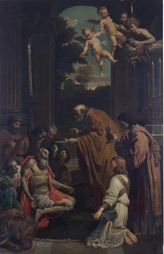 Keywords: El Viático a San Jerónimo, de Luis Álvarez Catalá (Museo de Jaén).JPG La escena que se desarrolla en el interior de una iglesia muestra a San Jerónimo que está próximo a recibir el viático postrado en el suelo y con las rodillas dobladas hacia un lado mientras es sostenido por diversos personajes siendo toda la escena contemplada por varios ángeles que se hallan en la parte superior derecha y en la parte inferior izquierda mientras que un león aparece acostado a los pies del santo Siglo XIX oil canvas Size cm 135 207 Museo de Jaén http //ceres mcu es/pages/Main object history exhibition history credit line accession number DE/BA00015 http //ceres mcu es/pages/Main PD-old-100 Luis Álvarez Catalá Uploaded with UploadWizard 19th-century paintings in the Museum of Jaén Spanish paintings of Saint Jerome |