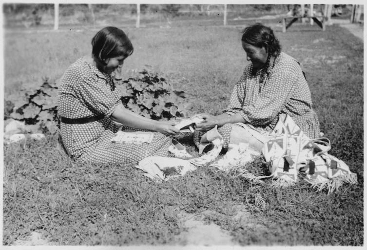 | Keywords: Elderly woman teaching her granddaughter the art of beadwork. - NARA - 285652.jpg Scope and content Grandma Rolls Off teaches granddaughter Cecelia Yellow Robe to make bead articles They are seated on the grass General notes 285652 Local identifier Department of the Interior Bureau of Indian Affairs Rosebud Agency 1947 - NARA's Central Plains Region Kansas City NREA 400 West Pershing Road Kansas City MO 64108 other date ~ 1936 Record group Record Group 75 Records of the Bureau of Indian Affairs 1793 - 1999 Record group ARC 404 Rosebud Agency Photographs compiled 1900 - 1960 Series ARC 285631 File unit File unit ARC Variant control numbers NAIL Control Number NRE-75-RBD PHO -523 Other versions <gallery> File Elderly_woman_teaching_her_granddaughter_the_art_of_beadwork _-_NARA_-_285652 tif tif File Elderly_woman_teaching_her_granddaughter_the_art_of_beadwork _-_NARA_-_285652 jpg jpg </gallery> NARA-cooperation PD-USGov Rosebud Indian Reservation Native American beadwork Native American culture |