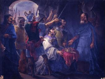Keywords: Elección de Wamba como rey (Real Academia de Bellas Artes de San Fernando).JPG El lienzo representa la elección de Wamba ¿ -688 como rey de los Visigodos Wamba rechazó el nombramiento debido a su avanzada edad pero fue forzado por la nobleza a aceptar el trono el día 1 de septiembre del año 672 en la localidad de Gertici o Gérticos después llamada Wamba en su honor y en la que había fallecido su antecessor el rey Recesvinto Por iniciativa propia a fin de que su elección no fuera considerada una usurpación Wamba exigió ser coronado rey en Toledo donde fue ungido el día 20 de septiembre por el obispo Quirico en la iglesia pretoriense de San Pedro y San Pablo Wamba renunció al trono en el año 680 y falleció en el año 688 y Fue sucedido en el trono por el rey Ervigio oil canvas cm 170 128 Institution Real Academia de Bellas Artes de San Fernando 0403 http //ceres mcu es/pages/Main http //ceres mcu es/pages/Main 1843 PD-old-100 Other versions Uploaded with UploadWizard Wamba Francisco de Paula Van Halen 19th-century paintings in the Royal Academy of Fine Arts of San Fernando 1843 paintings |