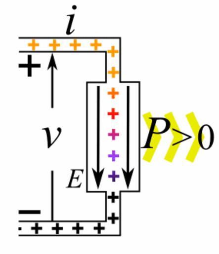 Keywords: Electric load animation 2.gif resistor light bulb electric motor or other passive electrical device The electric current flows into the positive terminal and out of the negative terminal The charges move under the influence of the electric field E in the direction of lower electric potential voltage The charges perform work on the component and lose potential energy color Therefore electric power p > 0 flows out of the circuit and into the component yellow arrows <br /><br /> This contrasts with an active device an electric power source such as a electric generator or battery In an active device the current is forced to flow into the negative terminal and out of the positive terminal in the direction of increasing electric potential Therefore work is done on the charges they gain potential energy and electric power flows out of the component into the circuit A companion source animation is located at Electric power source animation gif 2014-04-05 09 12 43 own Chetvorno cc-zero Uploaded with UploadWizard Negative resistance Electrical power conversion diagrams Resistor schemas Animated GIF |
