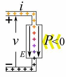 Keywords: Electric power source animation 2.gif electric power source such as a battery or electric generator or other active component In a power source the electric current i flows into the negative terminal and out of the positive terminal The electric charges are forced to move in the opposite direction to the electric field E in the direction of increasing electric potential gradient Work must be done on the charges to make them move in this direction The potential energy of the charges color is increased so electric power p < 0 flows out of the component into the circuit Therefore the component must have a source of power yellow arrows <br /><br /> In contrast in an electrical load such as a light bulb or electric motor or other passive component the current flows into the positive terminal and out of the negative terminal in the direction of lower potential energy So work is done by the charges on the component and power flows out of the circuit into the component A companion load animation is located at Electric load animation gif 2014-04-05 09 18 03 own Chetvorno cc-zero Uploaded with UploadWizard Negative resistance Electrical power conversion diagrams Animated GIF |