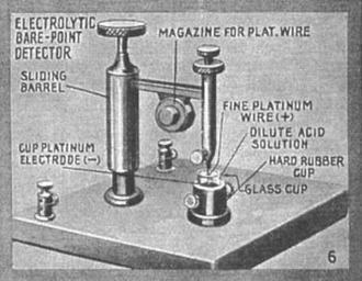Keywords: Electroldetc.jpg Circuit du poste à détecteur électrolytique Dès le début du XXe siècle Une pile un potentiomètre et un écouteur applique une tension au détecteur électrolytique La polarisation électrolytique de l'anode est très rapide L'anode est un fil de platine très fin de 1/100 de millimètre Le signal alternatif du circuit inductance-condensateur dépolarise partiellement l'anode aux rythmes de la modulation d'amplitude ce qui oblige la pile à fournir un nouveau courant pour repolariser l'anode L'écouteur parcouru par ce courant repolarisant aux rythmes de la modulation d'amplitude et fait entendre une image de la modulation La cathode est une plaque ou un gros fil de platine ou de plomb Le détecteur électrolytique fonctionne avec l'application d'une source auxiliaire bien déterminée entre 1 5 volt à 2 5 volts pour la fonction détectrice cathode anode Pour le réglage du détecteur électrolytique mètre la tension de la source auxiliaire au maximum environ 2 5 volts Dès que l'électrolyse de l'eau bouillonne un bruit et perçu dans l ™Ã©couteur réduire lentement la tension jusqu ™Ã la disparition complète de tout bruit Puis Connecter l ™antenne Refaire le réglage régulièrement et en cas de changement de température en cas de changement de pression barométrique en cas d ™une vibration en cas de choc ¦ Le détecteur électrolytique à une sensibilité de 7 nanowatts Le détecteur électrolytique est seulement utilisable dans les stations fixes instable aux vibrations aux mouvements Donc inutilisable dans les stations radios mobiles navires aéronefs ballons dirigeables stations portables Ce détecteur a été utilisé dans les récepteurs pour un usage à court terme en raison de son de la complexcité de l'entretien Circuit of an early radio receiver with electrolytic detector from the very start of the 20th century A battery and potentiometer apply a small bias voltage to the electrolytic detector The electrolytic polarization of the anode is very fast The anode is a very fine platinum wire 1/100 of millimetre in diameter while the cathode is a lead or platinum plate or large wire The alternating signal from the tuned circuit partially depolarizes the anode in response to the amplitude modulation which draws a DC current from the battery which varies with the modulation to repolarise the anode This current passes through the earphone which converts the audio current to sound The electrolytic detector functions with a bias voltage of between 1 5 and 2 5 volts To adjust it the bias voltage is first adjustad to maximum 2 5 volts As soon as water bubbles indicate that electrolysis is occurring and a noise is heard in the earphone the bias voltage is slowly turned down until the noise completely disappears Then the antenna is connected The detector must be readjusted in the event of a change of temperature barometric pressure vibration or shock The electrolytic detector has a sensitivity of 7 nanowatts It is unstable when subjected to movement or vibration so it is only usable in fixed stations not in portable or mobile radios ships aircraft or airships It was only used in early receivers for a short time due to its complexity of maintenance http //en wikipedia org/wiki/File Electroldetc jpg 2006-03-23 F1jmm Electrolytic detectors |