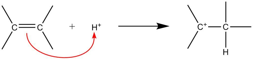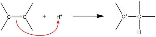 Keywords: Electrophilic addition hydron mechanism.png en Mechanism on the electrophilic addition to a carbon-carbon double bond by hydrogen cation Own Omegakent 2008-06-20 Reaction mechanisms