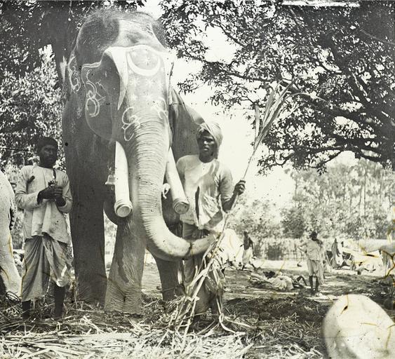 Keywords: Elephant, India, ca. 1920 (IMP-CSCNWW33-OS16-17).jpg en <br> Elephant India ca 1920 Black and white lantern slide showing a large elephant being led by two Indian men The elephant has been decorated with symbols for the moon and stars The tips of the animal's tusks look to have been cut off A bell hangs around the animal's neck The elephant may be taking part in a local festival or mela This slide comes from a collection created by missionaries from Regions Beyond Missionary Union an interdenominational Protestant evangelical mission working in northeast India Bihar and Orissa and Nepal Photographer Unknown Filename IMP-CSCNWW33-OS16-17 tif Coverage date 1915/1925 Subject unesco Animals; Customs and traditions Part of collection International Mission Photography Archive ca 1860-ca 1960 Part of subcollection Photographs from the Centre for the Study of World Christianity University of Edinburgh U K ca 1900-ca 1940s Repository name Centre for the Study of World Christianity Archival file Volume4/IMP-CSCNWW33-OS16-17 tif Repository address The University of Edinburgh School of Divinity New College Mound Place Edinburgh EH1 2LX United Kingdom Geographic subject country India Format aacr2 lantern slides 8 2 x 8 2cm Geographic subject continent Asia Rights Contact the repository for details Part of series Regions Beyond Missionary Union India uncaptioned slides CSCNWW33/OS16 Repository email divinity-CSWC ed ac uk Date created 1915/1925 Publisher of the digital version University of Southern California Libraries Subject aat genre general views Format aat lantern slides; photographs Geographic subject state Bihar Access conditions http //www ed ac uk/schools-departments/divinity/research/centres/world-christianity/collections-resources Geographic subject roadways File CSCNWW33/OS16/17 Subject lcsh Elephants; Festivals 1915/1925 date created author http //digitallibrary usc edu/cdm/ref/collection/p15799coll123/id/78343 PD-old-70-1923 Magic lantern images Images from USC Digital Library uploaded by Fæ International Mission Photography Archive ca 1860-ca 1960 Elephants of India |