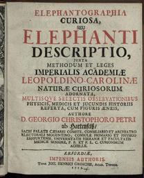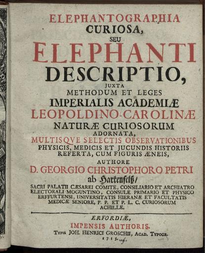 Keywords: Elephantographia Curiosa 007.jpg Elephantographia Curiosa Seu Elephanti Descriptio Juxta Methodum Et Leges Imperialis Academiæ Leopoldino-Carolinæ Naturæ Curiosorum Adornata Erfordiae 1715 http //resolver sub uni-goettingen de/purl PPN624711897 1715 Georg Christoph Petri von Hartenfels Elephantographia Curiosa PD-old-100 |