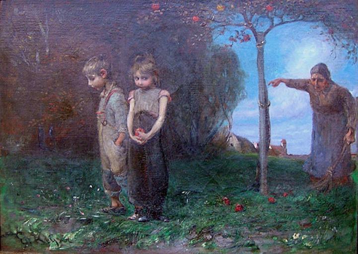 Keywords: Elisabeth Keyser Expulsion from the Garden of Eden.jpg artwork two children are expelled from an orchard by an old lady who caught them stealing apples oil on canvas in 15 5 21 5 http //www jamesalder co uk/ James Alder Fine Art by 1898 Creator Elisabeth Keyser PD-old-100 Images from James Alder Fine Art Elisabeth Keyser Expulsion of Adam and Eve Mischievous children in art Apples in art |