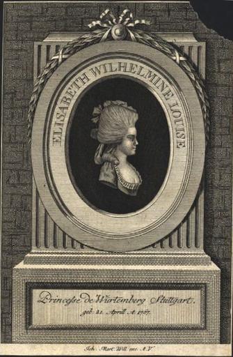 Keywords: Elisabeth Wilhelmine Luise Wuerttemberg 1767 1790 gravur1788.jpg Elisabeth Wilhelmine Louise Princesse of Württemberg 1767-1790 first wife of Archduke Franz Joseph Karl later Emperor Francis II of Holy Roman Empire Francis I of Austria Elisabeth Wilhelmine Louise Herzogin von Württemberg 1767-1790 erste Frau von Erzherzog Franz Joseph Karl von Habsburg-Toskana spaeter Kaiser Franz II von HRR Kaiser Franz I von Österreich Erzsébet Vilma Lujza württembergi hercegnő 1767-1790 habsburg-Toscanai Ferenc József Károly főherceg a későbbi II Ferenc német-római császár I Ferenc osztrák császár első felesége http //www worldroots com and http //www royaltyguide nl/index htm and http //www napoleonseries org/genealogy/5653 htm original around 1788 Johann Martin Witt Public domain due to old age PD-old Francis II Holy Roman Emperor Nobility of Germany Duchess Elisabeth of Württemberg |