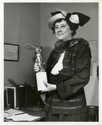 Keywords: smithsonian institution smithsonianinstitution smithsonian institution archives smithsonianinstitutionarchives 2012 women's history month womenshistorymonth women in science womeninscience woman standing award cornell research cancer oncology gynecology 1951 1950s fifties smile suit medicine doctor pathology pathologist hat eyeglasses glasses office desk fur older academia 20th century - mid 20thcenturymid 20th century - early 20thcenturyearly people photo border Subject: L'Esperance, Elise Depew Strang 1878-1959        Macfarlane, Catherine        Cornell University Type: Black-and-white photographs Date: 1951 Topic: Women scientists      Medicine      Cancer--Research Local number: SIA Acc. 90-105 [SIA2008-5264] Summary: Elise Depew Strang L'Esperance (1878-1959), Cornell University, shown here in 1951 with her Lasker Clinical Medical Research Award, was a pioneer in cancer treatment for women and had received the award jointly with Catherine Macfarlane. She earned an M.D. in 1902 but by 1908 had shifted from medical practice to research, becoming professor of pathology at Cornell University Medical College in 1920. In 1937, she founded the first cancer clinic focused on treatment of women Cite as: Acc. 90-105 - Science Service, Records, 1920s-1970s, Smithsonian Institution Archivess Persistent URL:Link to data base record Repository:Smithsonian Institution Archives View more collections from the Smithsonian Institution. Subject: L'Esperance, Elise Depew Strang 1878-1959        Macfarlane, Catherine        Cornell University Type: Black-and-white photographs Date: 1951 Topic: Women scientists      Medicine      Cancer--Research Local number: SIA Acc. 90-105 [SIA2008-5264] Summary: Elise Depew Strang L'Esperance (1878-1959), Cornell University, shown here in 1951 with her Lasker Clinical Medical Research Award, was a pioneer in cancer treatment for women and had received the award jointly with Catherine Macfarlane. She earned an M.D. in 1902 but by 1908 had shifted from medical practice to research, becoming professor of pathology at Cornell University Medical College in 1920. In 1937, she founded the first cancer clinic focused on treatment of women Cite as: Acc. 90-105 - Science Service, Records, 1920s-1970s, Smithsonian Institution Archivess Persistent URL:Link to data base record Repository:Smithsonian Institution Archives View more collections from the Smithsonian Institution.