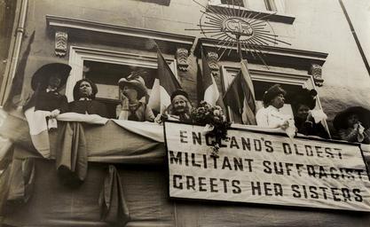 | Keywords: the women's library thewomenslibrary women suffrage politics hires monochrome 7JCC/O/02/076 Photograph, printed, paper, monochrome, seven women on a balcony, in the centre Elizabeth Wolstenholme Elmy, banner hanging from the balcony reads 'ENGLAND'S OLDEST MILITANT SUFFRAGIST GREETS HER SISTERS' 7JCC/O/02/076 Photograph, printed, paper, monochrome, seven women on a balcony, in the centre Elizabeth Wolstenholme Elmy, banner hanging from the balcony reads 'ENGLAND'S OLDEST MILITANT SUFFRAGIST GREETS HER SISTERS' |