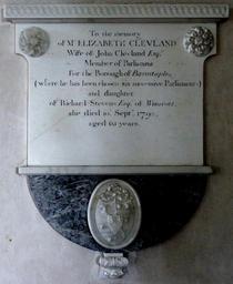 | Keywords: ElizabethClevland Died1792 PetersMarland Devon.JPG en Mural monument to Mrs Elizabeth Stevens 1727-1792 the daughter and heiress of Richard Stevens of Winscott in the parish of Peters Marland Devon and wife of John II Clevland 1734 “1817 of Tapeley MP for Barnstaple in seven parliaments and Director of Greenwich Hospital Inscribed as follows <blockquote> To the memory of Mrs Elizabeth Clevland wife of John Clevland Esq Member of Parliament for the Borough of Barnstaple where he has been chosen six successive parliaments and daughter of Richard Stevens of Winscott She died 16 September 1792 aged 65 years </blockquote> Below is a white marble relief sculpted escutcheon showing the following arms Quarterly 1st 4th Azure a hare salient or collared gules pendent therefrom a bugle horn stringed sable Clevland ; 2nd 3rd Vert two bars engrailed between three leopard's faces or Child baronets of the City of London 1685 Child of Surat East Indies and Dervill Essex Baronet created 1684 extinct 1753 Burke's Armorials 1884 the arms of William Clevland's mother Elizabeth Child Overall is an inescutcheon of pretence of Stevens Per chevron azure and gules in chief two falcons rising belled or own photo Lobsterthermidor <span class signature-talk ></span> 21 25 21 October 2014 UTC 2014 DEFAULTSORT Peters Marland 1727 births 1792 deaths Child of City of London arms Clevland arms St Peter's Church Peters Marland Stevens arms Wall mounted church monuments in Devon |