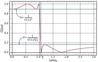 Keywords: Elliptic Filter Response (4th Order).svg elliptic filter Also shown is the maximum extent of the passband ripples where is the ripple factor and L<sub>n</sub> is the discrimination factor own Inductiveload 2009-01-29 Mathematica Code <pre><nowiki> xp2xi_ Module g num den g Sqrt4 xi 2 + 4 xi 2 xi 2 - 1 2/3 ; num 2 xi 2 Sqrtg; den Sqrt8 xi 2 xi 2 + 1 + 12 g xi 2 - g 3 - Sqrtg 3; num/den; xz2xi_ xi 2/xp2xi; txi_ Sqrt1 - 1/xi 2; Use particular values for low-order functions r1xi_ x_ x; r2xi_ x_ txi + 1 x 2 - 1 / txi - 1 x 2 + 1 ; r3xi_ x_ x 1 - xp2xi x 2 - xz2xi / 1 - xz2xi x 2 - xp2xi ; Use nesting property for higher-degree functions r4xi_ x_ r2r2xi xi r2xi x; ellgainxi_ w_ w0_ ep_ 1/Sqrt1 + ep 2 r4xi w/w0 2; Plot ellgain1 05 w 1 0 5 w 0 3 </nowiki></pre> Elliptic filters |