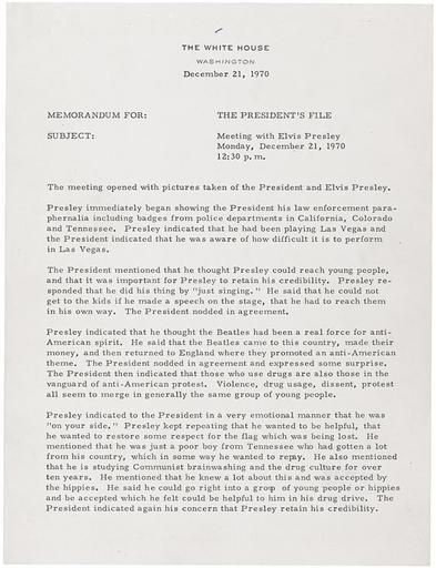 | Keywords: Elvis-Nixon Meeting Notes - Page 1 of 2.jpg en Memorandum for the President's File from Egil Bud Krogh Re Meeting with Elvis Presley 21 December 1970 http //www archives gov/exhibits/nixon-met-elvis/main php Egil Krogh 1970-12-21 PD-USGov PD-USGov-POTUS Elvis Presley War on Drugs in the United States |
