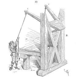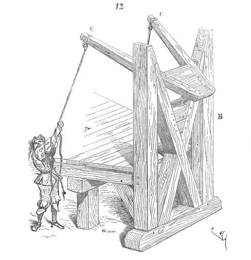 | Keywords: Embrasure.a.volet.png Comme aujourd'hui les ingénieurs militaires se préoccupaient de masquer les embrasures lorsqu'on chargeait les pièces en batterie à cet effet ils employaient des claies épaisses des volets glissant sur des coulisses des rideaux d'étoupe capitonnés De tous ces moyens l'un des plus ingénieux est celui que nous donnons 12 En A on voit la plate-forme en charpente recouverte de madriers sur laquelle roule la pièce en batterie Contre la paroi intérieure du parapet est posé le bâtis B muni à sa partie supérieure d'un volet triangulaire roulant sur un axe et mu par deux leviers C Viollet-le-Duc Technology Viollet-le-Duc Ranged weapon Viollet-le-Duc Drawings of embrasures Medieval siege warfare |
