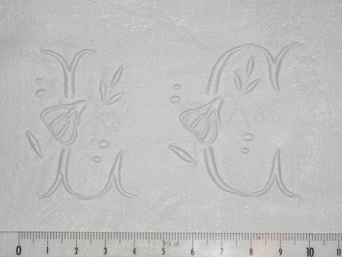 | Keywords: Embroidered letters LC.jpg en Embroidered letters L C on a napkin of the outfit of a young maid France fr Lettres brodées L C sur une serviette de table du trousseau de jeune fille France own Tangopaso ~ 1940 thumb left The sames on a bed sheet Textile napkins Embroidery of France Monograms LC LC letter combinations Monogram embroidered |