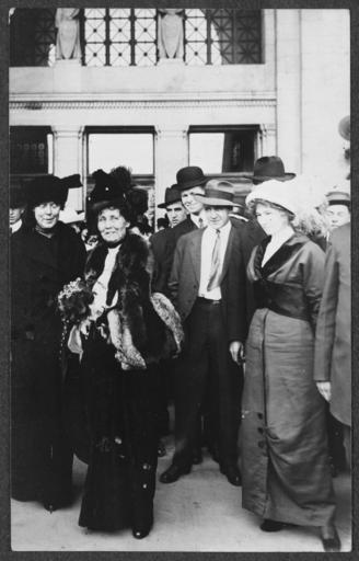 Keywords: Emmeline Pankhurst, in furs at center, 276003v.jpg Emmeline Pankhurst in furs at center on her speaking tour in United States 1913 Lucy Burns is to the left Frederick A Schutz Washington D C Photographer ca 1914 Summary Photograph of Lucy Burns left in coat and hat and Emmeline Pankhurst center wearing feathered hat fur stole and fur muff with a third woman right and crowd of men likely taken during Pankhurst's October 1913 speaking tour of the United States Title transcribed from item Also on verso Left to Right- Miss Lucy Burns Mrs Pankhurst just released from a hunger strike London Eng 1 postcard 3 5 x 5 5 in accession number Call Number Location National Woman's Party Records Group II Container II 276 Folder Group Photographs Nos 1-7 Source Collection Records of the National Woman's Party institution Library of Congress Manuscript Division http //hdl loc gov/loc mss/mnwp 276003 PD-old suffragettes Lucy Burns Emmeline Pankhurst Interior of Union Station Washington D C Fur fashion in 1914 |