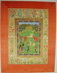Keywords: Emperor Azam Shah.jpg en Emperor Azam Shah garbed in white is carried in a golden palanquin His horse is saddled and ready nearby Soldiers holding large quivers of bows and arrows are lined up in the foreground Attendants hold deer and gazelles on leashes This is in preparation for shikar or hunting In the background is an army of elephants with royal flags cavalry and infantry and a city scape in the far left corner Undulating hills and a lake form the backdrop 19thC early http //www britishmuseum org/research/search_the_collection_database/search_object_details aspx objectid 178428 partid 1 searchText mughal fromADBC ad toADBC ad numpages 10 images on orig 2fresearch 2fsearch_the_collection_database aspx currentPage 48 Mughal Style PD-Art Azam Shah Uploaded with UploadWizard Paintings of Mughal emperors |