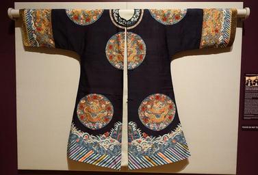 Keywords: Empress or empress dowager's long gua (surcoat), China, Qing dynasty, late 19th century, silk, metal-wrapped silk, view 1 - Textile Museum, George Washington University - DSC09472.JPG en Exhibit in the Textile Museum George Washington University Washington DC USA Photography was permitted in the museum without restriction This work is old enough so that it is in the public domain 2015-03-26 15 09 52 own Daderot other versions PD-old-70 cc-zero Textiles of China in the Textile Museum George Washington University Imperial clothing of China |