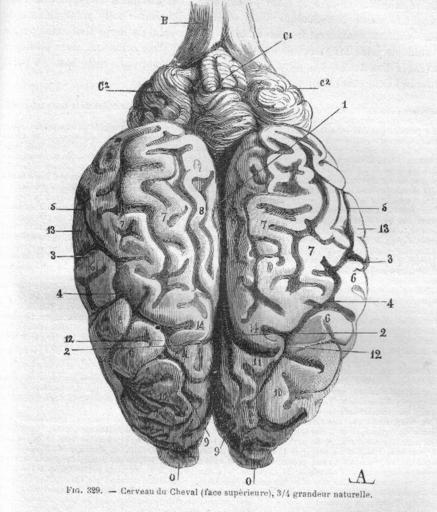 | Keywords: EncephaleCv1Chauveau1890MeyCh.jpg en The horse's encephalon Equus caballus fr Face supérieure de l'encéphale du cheval Equus caballus <br /> 1 scissure inter-hémisphérique 2 sillon crucial <br /> 3 sillon de Rollando 4 sa branche antérieure <br /> 5 sa branche postérieure <br /> 6 replis de la circonvolution frontale ascendante <br /> 7 les 2 plis de la circonvolution pariéto-occipitale externe<br /> 8 circonvolution pariéto-occipitale interne <br /> 9 1re circonvolution frontale 10 2e circonvolution frontale <br /> 11 gyrus sigmoïde 13 lobule du pli courbe <br /> B bulbe rachidien C2 lobes latéraux du cervelet O lobules olfactifs <br /> ” Chauveau Auguste Arloing Saturnin Traité d'anatomie comparée des animaux domestiques <br /> 1 064 p page 763 1890 Paris Lib J B Baillière et Fils domaine public décès des auteurs 1917 et 1911 Meyer Ch 2011-04-08 PD-old Horse brain |
