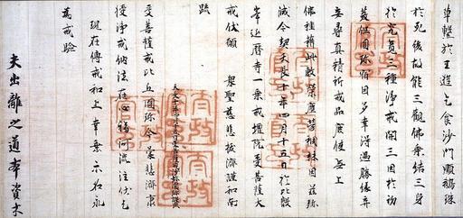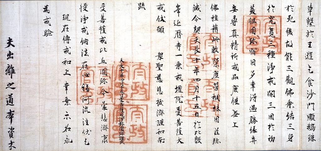 Keywords: Enchin ordination document.jpg en This document is part of an official certificate issued for Enchin when he received the bodhisattva precepts from Abbot Gishin at the Enryaku-ji Temple ordination platform in 833 Tenchô 10 It is signed with the names of three administrative officers J bettô This document is part of the national treasure Documents related to the priest Enchin 円珍関係文書 enchin kankei monjo http //www tnm go jp/en/servlet/Con pageId E16 processId 01 col_id B2405 2 img_id C0035538 ref Q1 Q2 Q3 Q4 Q5 F1 F2 Tokyo National Museum Author 833 PD-old-100 National Treasures of Japan ancient documents |