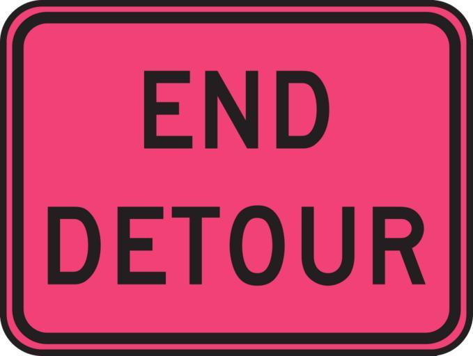 Keywords: end detour sign signage information motorists notice travel purple