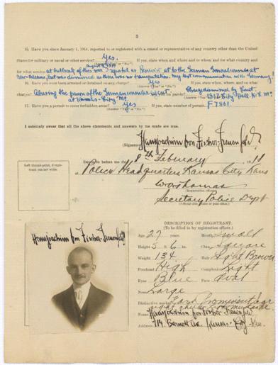 | Keywords: u.s. national archives usnationalarchives documented rights exhibit documentedrightsexhibit world war i worldwari the great war thegreatwar nara:arcid=2641493 enemy alien affidavit document text Title: Enemy Alien Registration Affidavit of Hans Joachim von Fischer-Treuenfeld, 02/08/1918 From: Record Group/Collection: 118 Record Hierarchy Level: Item Reference Unit: National Archives at Kansas City Persistent URL: catalog.archives.gov/id/2641493 Repository Contact Information: NARA’s Central Plains Region (Kansas City) (NREA), 400 West Pershing Road, Kansas City, MO, 64108. . Reproductions may be ordered via an independent vendor. NARA maintains a list of vendors at www.archives.gov/research/order/vendors-photos-maps-dc.html Access Restrictions: Unrestricted Use Restrictions: Unrestricted Title: Enemy Alien Registration Affidavit of Hans Joachim von Fischer-Treuenfeld, 02/08/1918 From: Record Group/Collection: 118 Record Hierarchy Level: Item Reference Unit: National Archives at Kansas City Persistent URL: catalog.archives.gov/id/2641493 Repository Contact Information: NARA’s Central Plains Region (Kansas City) (NREA), 400 West Pershing Road, Kansas City, MO, 64108. . Reproductions may be ordered via an independent vendor. NARA maintains a list of vendors at www.archives.gov/research/order/vendors-photos-maps-dc.html Access Restrictions: Unrestricted Use Restrictions: Unrestricted |