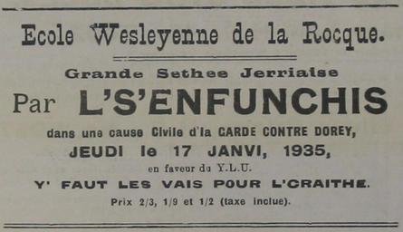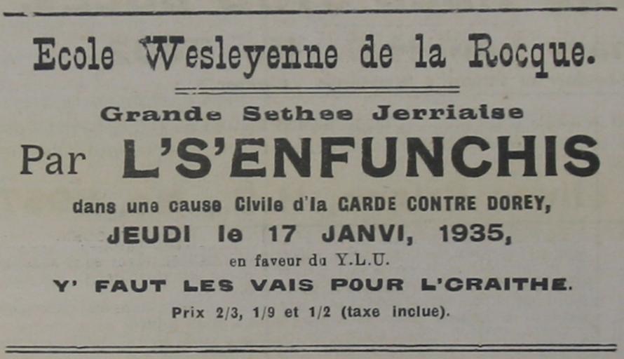 Keywords: Enfuntchis La Rocque 17 Janvyi 1935.jpg Advertisement for theatrical play performance 17 January 1935 by Jèrriais acting troupe L's Enfuntchis Advertisement from newspaper Les Chroniques de Jersey January 1935 Own 2007-10-14 Man vyi Advertisements in Jersey Jèrriais 17 January Newspapers of Jersey Grouville 1935 advertisements 1935 in theatre Theatre of Jersey January 1935 |