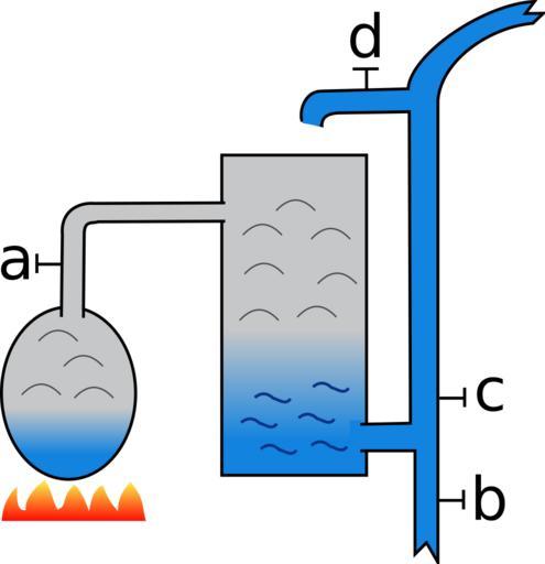 Keywords: Engine savery.svg en Thomas Savery steam engine outline Valves a and c are both opened simultaneously Steam gets into the cylinder shoving water through c Valbes b and d are opened while a and c are closed Cold water is sprayed over the cylinder provoking the steam to condense which causes a vacuum which sucks out water from mine es Esquema de una máquina de vapor de Thomas Savery Las válvulas a y c se abren a la vez El vapor entra en el cilindro y empuja el agua a través de c Se abren las válvulas b y d se cierran a y c Sobre el cilindro se rocía agua fría que condensa el vapor creando un vacío que succiona el agua de la mina Savery-Dampfpumpe<br /> a Steuerhahn<br /> b Rückschlagventil<br /> c Rückschlagventil<br /> 2014-07-04 10 36 19 own MdeVicente cc-zero Uploaded with UploadWizard Drawings of steam engines Savery steam pumps |