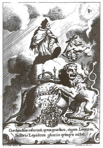 | Keywords: Engraving Czechia.jpg en Symbolic subtitle of the engraving originally from the dissertation of Th J Siddener reprinted in the book by Vít Vlnas Jan Nepomucký Czech legend frontispiece 2011-07-11 Vít Vlnas 1993 Jan Nepomucký česká legenda Prague Mladá fronta p 282 ISBN 80-204-0358-2 J F Fischer 1722 PD-old-100 Engravings from the Czech Republic Book pages in Latin Engravings of Saint John of Nepomuk Lion of Bohemia Frontispieces from the Czech Republic Books from the Czech Republic Eye of Providence |