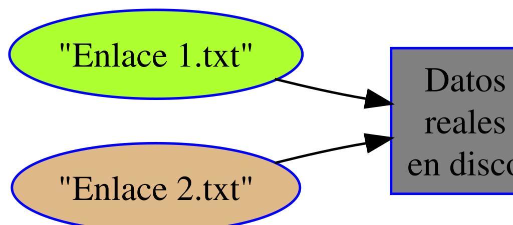 Keywords: Enlace duro.svg Illustration del concepto de e es enlace duro realizada con Graphviz Own 2007-08-17 Jesus Centella <gallery> Image Hard Link Illustration svg versión en inglés </gallery> Graphviz code digraph G graph rankdir LR; node style filled color blue; data shape box fillcolor gray label Datos\nreales en\nel disco ; linkA fillcolor greenyellow label Enlace 1 txt ; linkB fillcolor burlywood label Enlace 2 txt ; linkA -> data; linkB -> data; Check categories 2009 April 30 es wikipedia Enlace_duro 1 File systems |