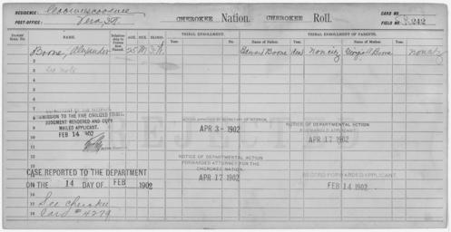 | Keywords: Enrollment for Cherokee Census Card R242 - NARA - 259305.tif Scope and content Name Alexander Boone Type Rejected Age 25 Sex Male Degree Indian Blood Intermarried White City of Residence Vera Name Edward Boone Type Parent Sex Male Name Georgia Boone Type Parent Sex Female General notes 259305 Local identifier 75-53A-CHEROKEE R242 Department of the Interior Office of Indian Affairs Office of the Commissioner to the Five Civilized Tribes 1893 - 1914 NARA's Southwest Region Fort Worth NRFA 1400 John Burgess Drive Fort Worth TX 76140 Record group Record Group 75 Records of the Bureau of Indian Affairs 1793 - 1999 Record group ARC 404 Enrollment Cards compiled 1898 - 1914 Series ARC 251747 File unit File unit ARC Variant control numbers NAIL Control Number NRFF-75-53A-2045<br /> NAIL Control Number NRFF-75-53A-2046<br /> NAIL Control Number NRFF-75-53A-2047<br /> NAIL Control Number NRFF-75-53A-CHEROKEE R242 yes Other versions <gallery> File Enrollment_for_Cherokee_Census_Card_R242_-_NARA_-_259305 tif tif File Enrollment_for_Cherokee_Census_Card_R242_-_NARA_-_259305 jpg jpg </gallery> NARA-cooperation PD-USGov Cherokee census cards NARA TIF images with categorized JPGs |