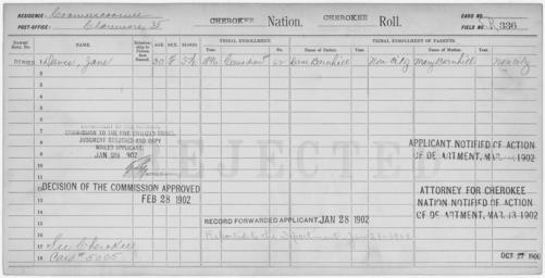 Keywords: Enrollment for Cherokee Census Card R336 - NARA - 259399.tif Scope and content Name Dave Barnhill Type Parent Sex Male Name Mary Barnhill Type Parent Sex Female Name Jane Davis Type Rejected Age 30 Sex Female Degree Indian Blood Intermarried White City of Residence Claremore General notes 259399 Local identifier 75-53A-CHEROKEE R336 Department of the Interior Office of Indian Affairs Office of the Commissioner to the Five Civilized Tribes 1893 - 1914 NARA's Southwest Region Fort Worth NRFA 1400 John Burgess Drive Fort Worth TX 76140 Record group Record Group 75 Records of the Bureau of Indian Affairs 1793 - 1999 Record group ARC 404 Enrollment Cards compiled 1898 - 1914 Series ARC 251747 File unit File unit ARC Variant control numbers NAIL Control Number NRFF-75-53A-1108<br /> NAIL Control Number NRFF-75-53A-1109<br /> NAIL Control Number NRFF-75-53A-5065<br /> NAIL Control Number NRFF-75-53A-CHEROKEE R336 yes Other versions <gallery> File Enrollment_for_Cherokee_Census_Card_R336_-_NARA_-_259399 tif tif File Enrollment_for_Cherokee_Census_Card_R336_-_NARA_-_259399 jpg jpg </gallery> NARA-cooperation PD-USGov Cherokee census cards NARA TIF images with categorized JPGs |