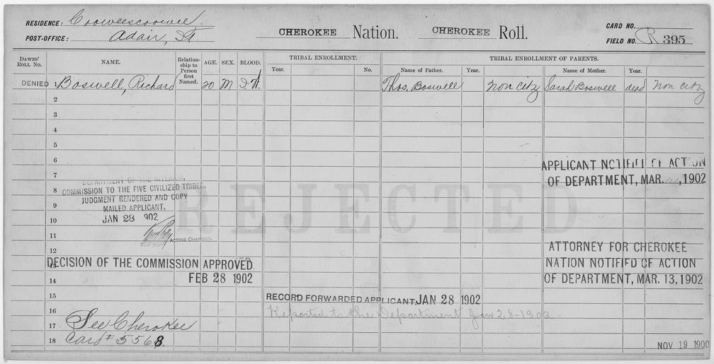 | Keywords: Enrollment for Cherokee Census Card R395 - NARA - 259458.tif Scope and content Name Richard Boswell Type Rejected Age 20 Sex Male Degree Indian Blood Intermarried White City of Residence Adairejected Name Sarah Boswell Type Parent Sex Female Name Thomas Boswell Type Parent Sex Male General notes 259458 Local identifier 75-53A-CHEROKEE R395 Department of the Interior Office of Indian Affairs Office of the Commissioner to the Five Civilized Tribes 1893 - 1914 NARA's Southwest Region Fort Worth NRFA 1400 John Burgess Drive Fort Worth TX 76140 Record group Record Group 75 Records of the Bureau of Indian Affairs 1793 - 1999 Record group ARC 404 Enrollment Cards compiled 1898 - 1914 Series ARC 251747 File unit File unit ARC Variant control numbers NAIL Control Number NRFF-75-53A-2068<br /> NAIL Control Number NRFF-75-53A-2069<br /> NAIL Control Number NRFF-75-53A-2071<br /> NAIL Control Number NRFF-75-53A-CHEROKEE R395 yes Other versions <gallery> File Enrollment_for_Cherokee_Census_Card_R395_-_NARA_-_259458 tif tif File Enrollment_for_Cherokee_Census_Card_R395_-_NARA_-_259458 jpg jpg </gallery> NARA-cooperation PD-USGov Cherokee census cards NARA TIF images with categorized JPGs |