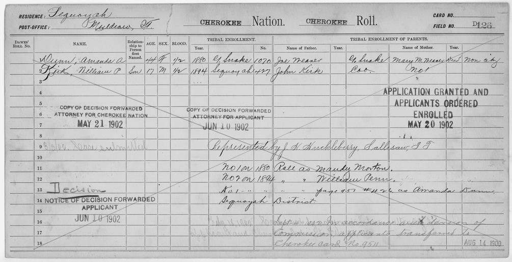 | Keywords: Enrollment for Cherokee Census Card D126 - NARA - 251874.tif Local identifier 75-53A-CHEROKEE D126 Department of the Interior Office of Indian Affairs Office of the Commissioner to the Five Civilized Tribes 1893 - 1914 NARA's Southwest Region Fort Worth NRFA 1400 John Burgess Drive Fort Worth TX 76140 Record group Record Group 75 Records of the Bureau of Indian Affairs 1793 - 1999 Record group ARC 404 Enrollment Cards compiled 1898 - 1914 Series ARC 251747 Variant control numbers NAIL Control Number NRFF-75-53A-10783<br /> NAIL Control Number NRFF-75-53A-10797<br /> NAIL Control Number NRFF-75-53A-20970<br /> NAIL Control Number NRFF-75-53A-20989<br /> NAIL Control Number NRFF-75-53A-5829<br /> NAIL Control Number NRFF-75-53A-CHEROKEE D126 General notes Scope and content Name Amanda A Dunn Type Doubtful Age 44 Sex Female Degree Indian Blood 1/2 City of Residence Muldrow Name John Kirk Type Parent Sex Male Name William P Kirk Type Doubtful Age 17 Sex Male Degree Indian Blood 1/2 City of Residence Muldrow Name Joe Weaver Type Parent Sex Male Name Mary M Weaver Type Parent Sex Female File unit File unit ARC yes <gallery> File Enrollment_for_Cherokee_Census_Card_D126_-_NARA_-_251874 tif tif File Enrollment_for_Cherokee_Census_Card_D126_-_NARA_-_251874 jpg jpg </gallery> NARA-cooperation PD-USGov Cherokee census cards NARA TIF images with categorized JPGs |