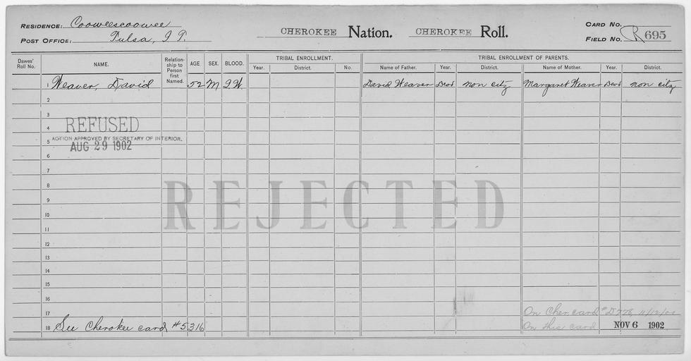 | Keywords: Enrollment for Cherokee Census Card R695 - NARA - 259758.tif Scope and content Name David Weaver Type Rejected Age 52 Sex Male Degree Indian Blood Intermarried White City of Residence Tulsa Name David Weaver Type Parent Sex Male Name Margaret Weaver Type Parent Sex Female General notes 259758 Local identifier 75-53A-CHEROKEE R695 Department of the Interior Office of Indian Affairs Office of the Commissioner to the Five Civilized Tribes 1893 - 1914 NARA's Southwest Region Fort Worth NRFA 1400 John Burgess Drive Fort Worth TX 76140 Record group Record Group 75 Records of the Bureau of Indian Affairs 1793 - 1999 Record group ARC 404 Enrollment Cards compiled 1898 - 1914 Series ARC 251747 File unit File unit ARC Variant control numbers NAIL Control Number NRFF-75-53A-20958<br /> NAIL Control Number NRFF-75-53A-20959<br /> NAIL Control Number NRFF-75-53A-20984<br /> NAIL Control Number NRFF-75-53A-CHEROKEE R695 yes Other versions <gallery> File Enrollment_for_Cherokee_Census_Card_R695_-_NARA_-_259758 tif tif File Enrollment_for_Cherokee_Census_Card_R695_-_NARA_-_259758 jpg jpg </gallery> NARA-cooperation PD-USGov Cherokee census cards NARA TIF images with categorized JPGs |
