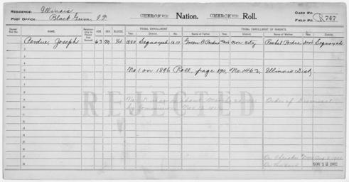 Keywords: Enrollment for Cherokee Census Card R747 - NARA - 259810.tif Scope and content Name Green B Perdue Type Parent Sex Male Name Joseph Perdue Type Rejected Age 63 Sex Male Degree Indian Blood 1/4 City of Residence Black Gum Name Rachel Perdue Type Parent Sex Female General notes 259810 Local identifier 75-53A-CHEROKEE R747 Department of the Interior Office of Indian Affairs Office of the Commissioner to the Five Civilized Tribes 1893 - 1914 NARA's Southwest Region Fort Worth NRFA 1400 John Burgess Drive Fort Worth TX 76140 Record group Record Group 75 Records of the Bureau of Indian Affairs 1793 - 1999 Record group ARC 404 Enrollment Cards compiled 1898 - 1914 Series ARC 251747 File unit File unit ARC Variant control numbers NAIL Control Number NRFF-75-53A-14870<br /> NAIL Control Number NRFF-75-53A-14873<br /> NAIL Control Number NRFF-75-53A-14877<br /> NAIL Control Number NRFF-75-53A-CHEROKEE R747 yes Other versions <gallery> File Enrollment_for_Cherokee_Census_Card_R747_-_NARA_-_259810 tif tif File Enrollment_for_Cherokee_Census_Card_R747_-_NARA_-_259810 jpg jpg </gallery> NARA-cooperation PD-USGov Cherokee census cards NARA TIF images with categorized JPGs |